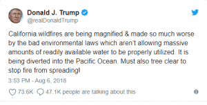 “Esto parece un intento confuso de relacionar los terribles incendios de California con nuestros siempre contenciosos debates sobre el agua”, dijo Peter Gleick, un científico medioambiental. “Parte de lo que dijo da a entender que no había suficiente agua para combatir el fuego en California por culpa de nuestras políticas con respecto al agua, lo que no tiene ningún sentido. Hay suficiente agua para combatir las llamas. Ni siquiera usamos tanta agua para apagar incendios, pero hay suficiente. Tres de las masas de agua más grandes del estado están muy cerca de estos incendios. Es ridículo”.