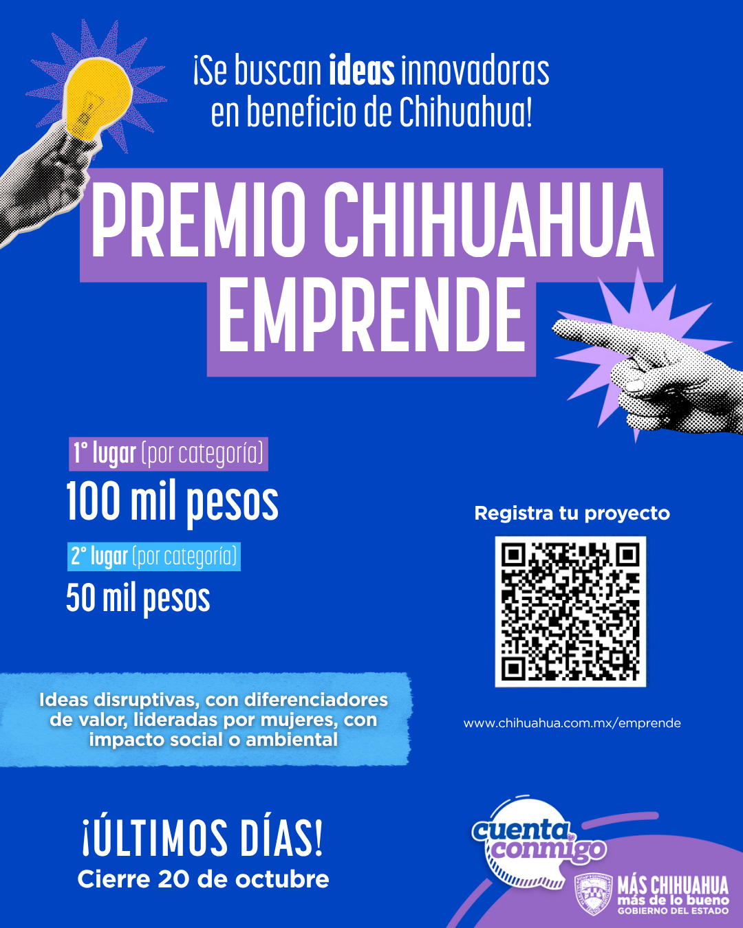 El Gobierno del Estado de Chihuahua, a través de la Secretaría de Innovación y Desarrollo Económico (SIDE) invita a los emprendedores chihuahuenses a registrarse en la convocatoria del Premio Chihuahua Emprende 2025, que permanecerá abierta hasta el próximo 20 de octubre.
