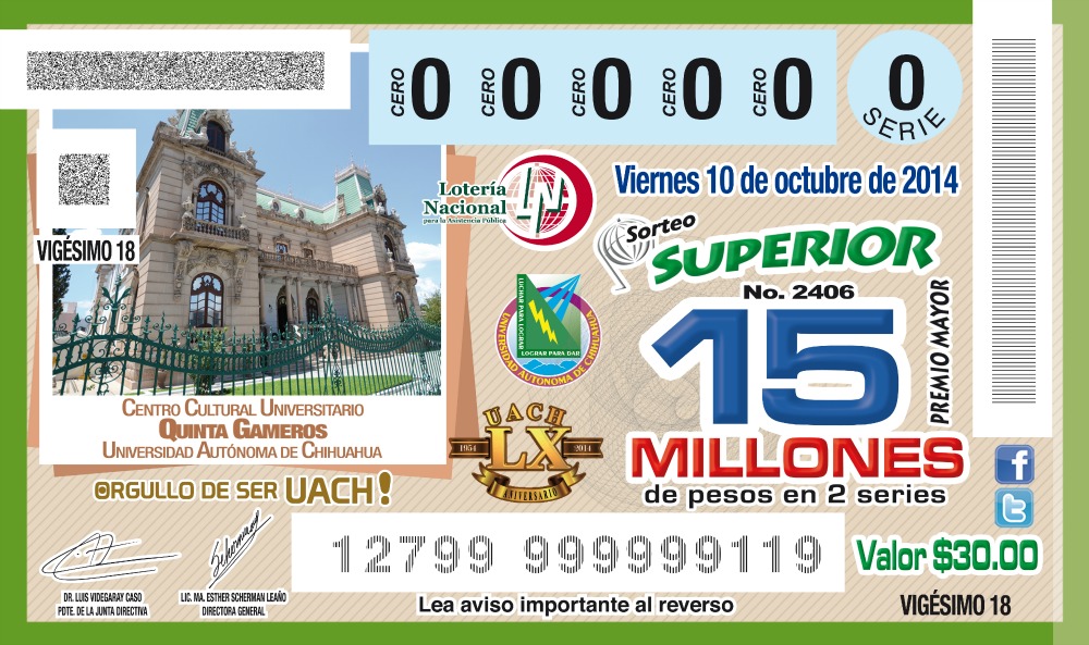 A partir de hoy martes 26 de agosto, la Lotería Nacional para la Asistencia Pública puso a la venta en el estado de Chihuahua el billete conmemorativo al Sexagésimo Aniversario de la Universidad Autónoma de Chihuahua.