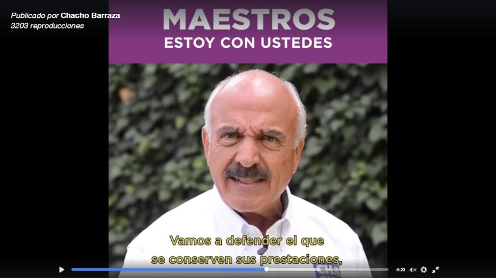 José Luis “Chacho” Barraza González, Candidato Independiente a Gobernador, a través de un video en su cuenta de la red social Facebook, se dirige a los maestros del estado a quienes reitera que conoce la problemática que enfrenta todo el magisterio a nivel nacional con la nueva Ley de Educación que busca unificar criterios y condiciones laborales para todo el país; “`por lo que quiero decirles que voy a defender los logros que han tenido como empleados, tales como las condiciones actuales de jubilación y la Comisión Mixta de Escalafón, para que de manera justa, y con base en sus méritos, logren los ascensos en su carrera y dentro de la estructura magisterial” externó el también empresario.