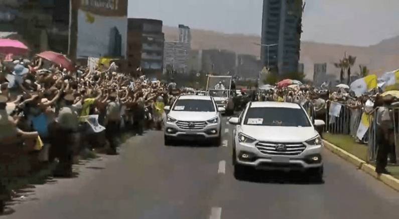 Francisco se trasladaba en el tradicional papamóvil por las calles de Iquique rumbo a la Casa de Retiro Nuestra Señora de Lourdes, donde almorzará con el séquito papal tras oficiar la tercera y última misa masiva en Chile, en la playa de Lobito de Iquique.